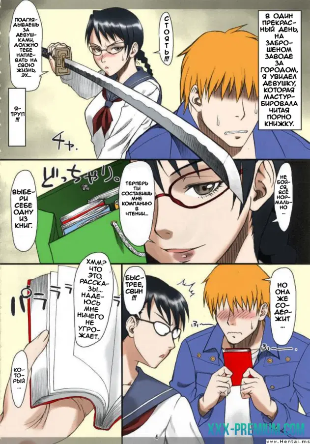 Манга фанфик в цвете по вселенной блич,повествует о девушке, которая тайком забралась на заброшенный завод, что бы уединится. Но, то ли на радость, то ли на беду ее обнаруживает парень за мастурбацией. Все было бы замечательно у парня, если бы в один прекрасный момент, катана не была бы приставлена к его горлу...