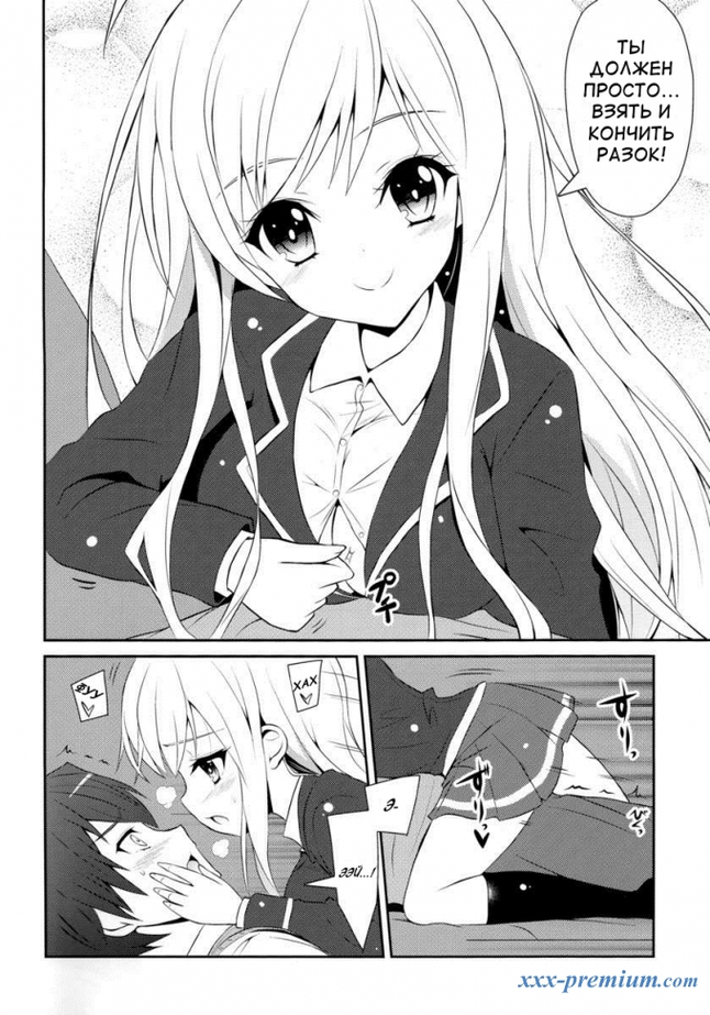 Тем временем в манге Chocolat to Full Course:"Твой банан увеличился в штанах. Я так рада, что наконец-то ты увидел во мне женщину. Ты должен просто... взять и кончить разок!"